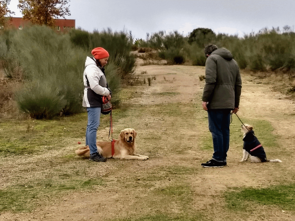 A continuación, las presentaciones de perros. Realizamos ejercicios pautados individualmente, en parejas o pequeños grupos, según las necesidades de cada familia. En este momento nos centramos en las personas, y mostramos cómo enseñar a un perro a socializar. Con ayuda de quien guía, estaremos pendientes de las señales caninas, el estrés, la ansiedad, la alta excitación y todo aquello que nos transmitan para detectar si un perro tiene miedo o demasiado nerviosismo, para regular cada situación.